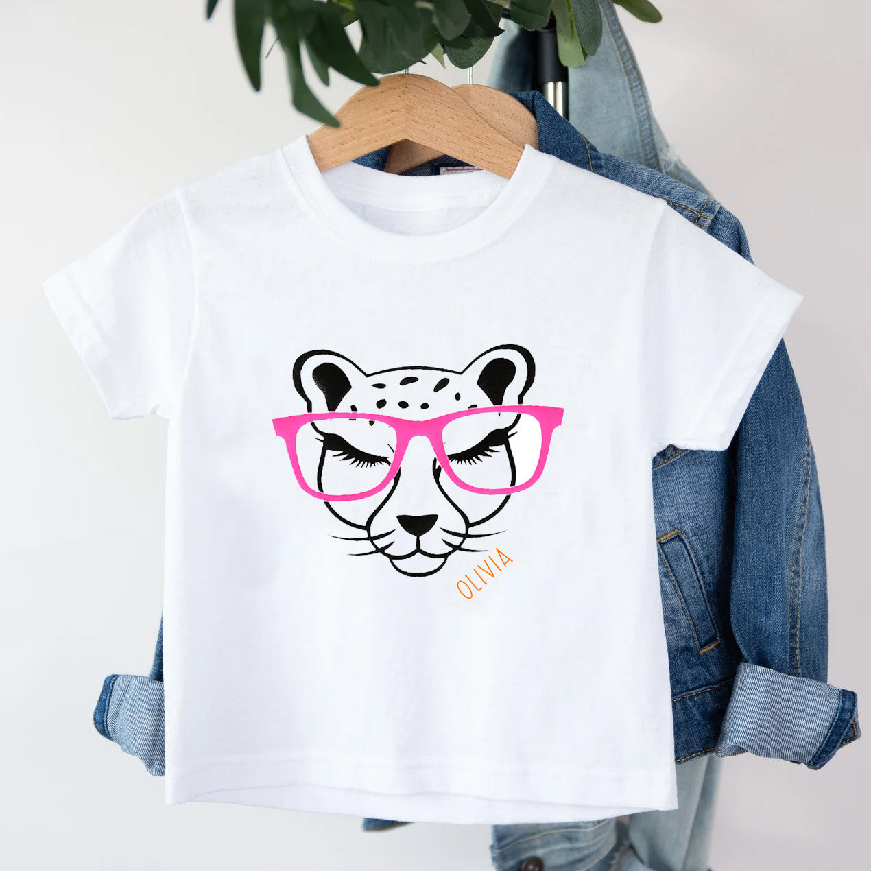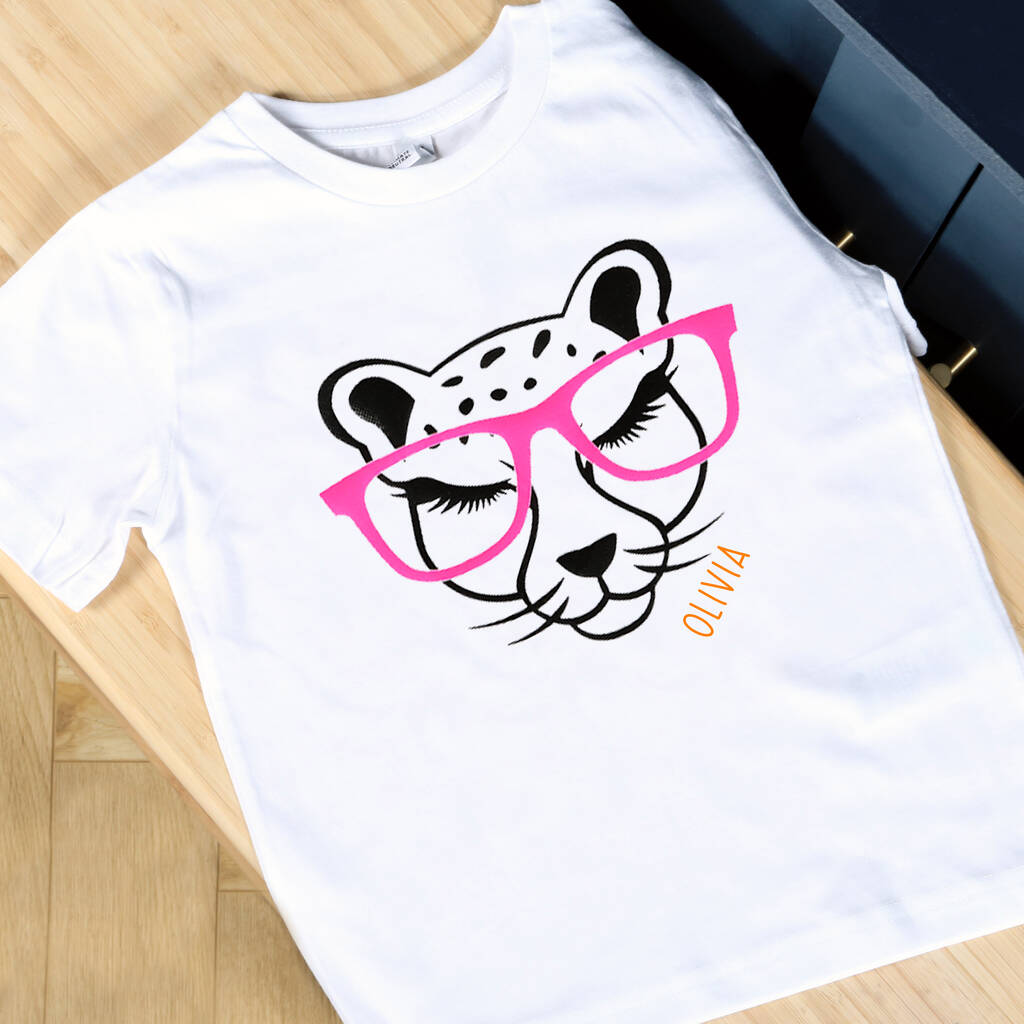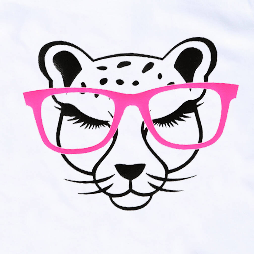 The white organic t shirt is soft to the touch and features a cute cheetah motif with glasses.