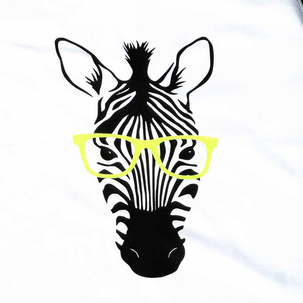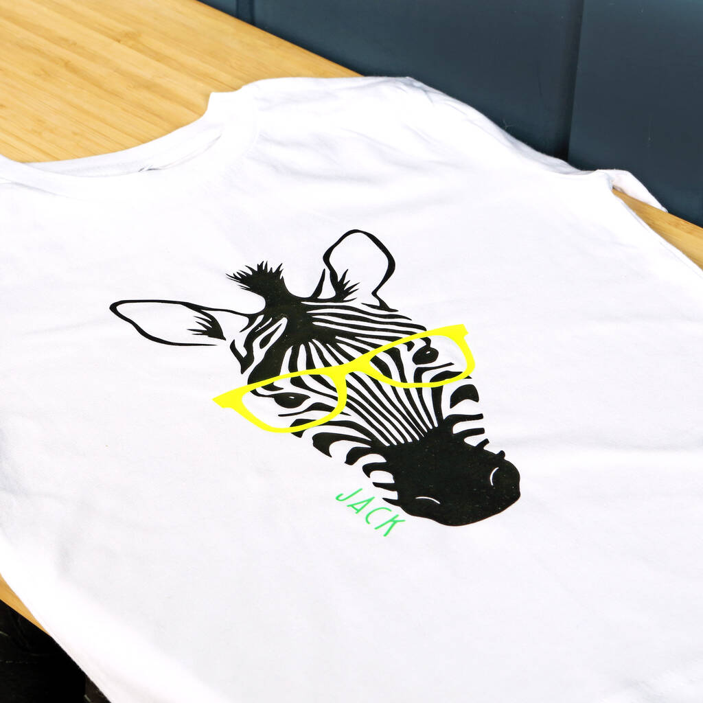 Fabulous organic white cotton tshirt with handsome zebra face and fluroescent glasses. Optional personalisation.
