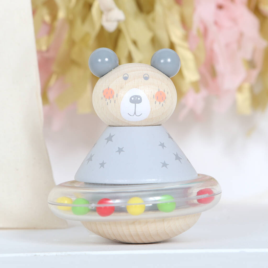 When these cute wooden tumbler toys are pushed, they rock back and forth while the colourful little beads in the wrap-around plastic ring makes exciting noises.
