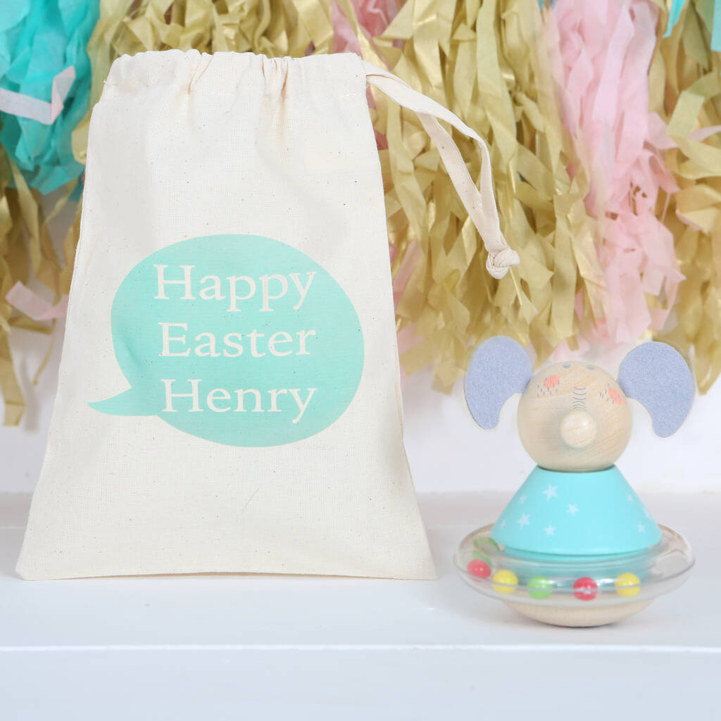 Cute little elephant tumber rattle toy in a personalised cotton bag, perfect little Christmas gift for a new baby or baby shower