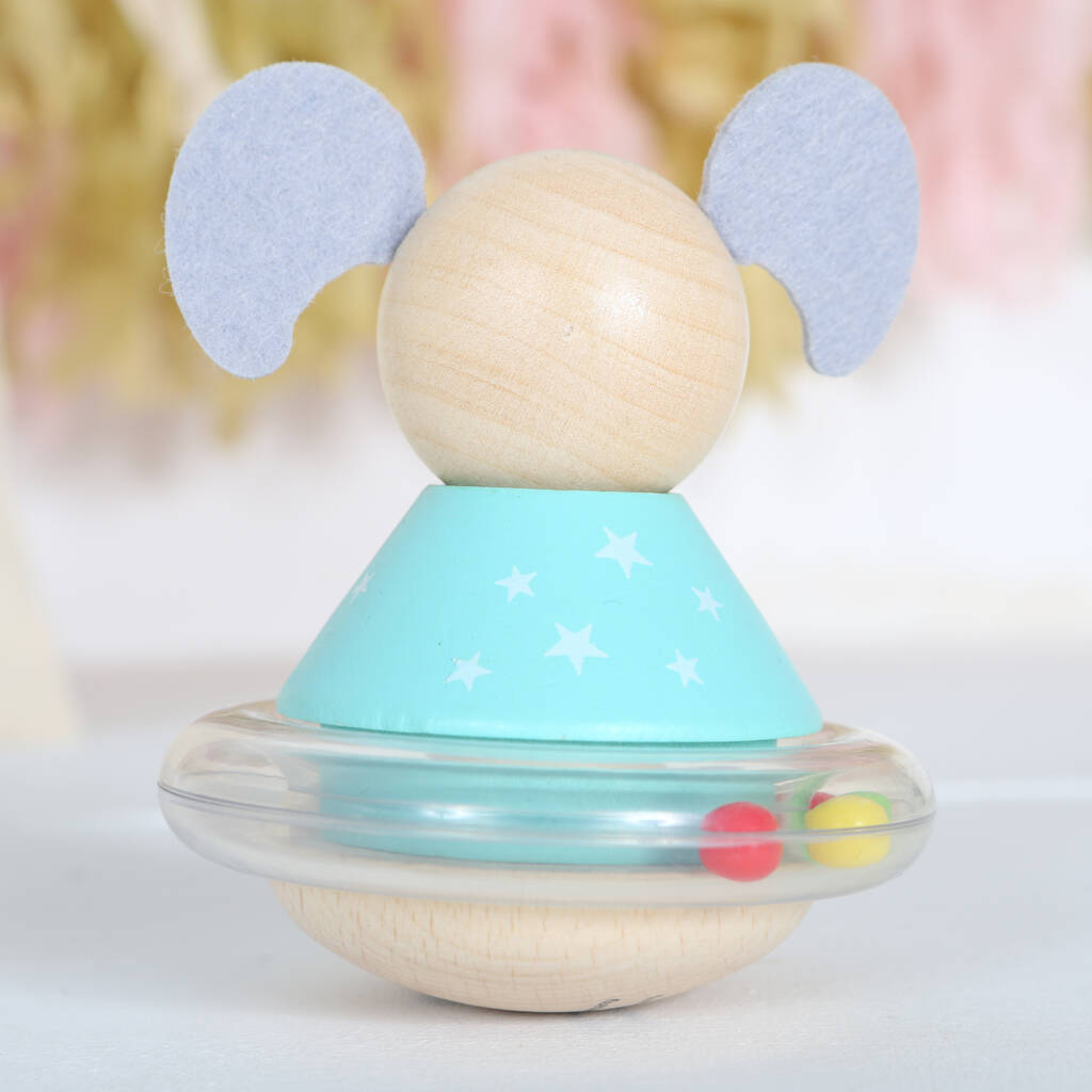 When these cute wooden tumbler toys are pushed, they rock back and forth while the colourful little beads in the wrap-around plastic ring makes exciting noises.