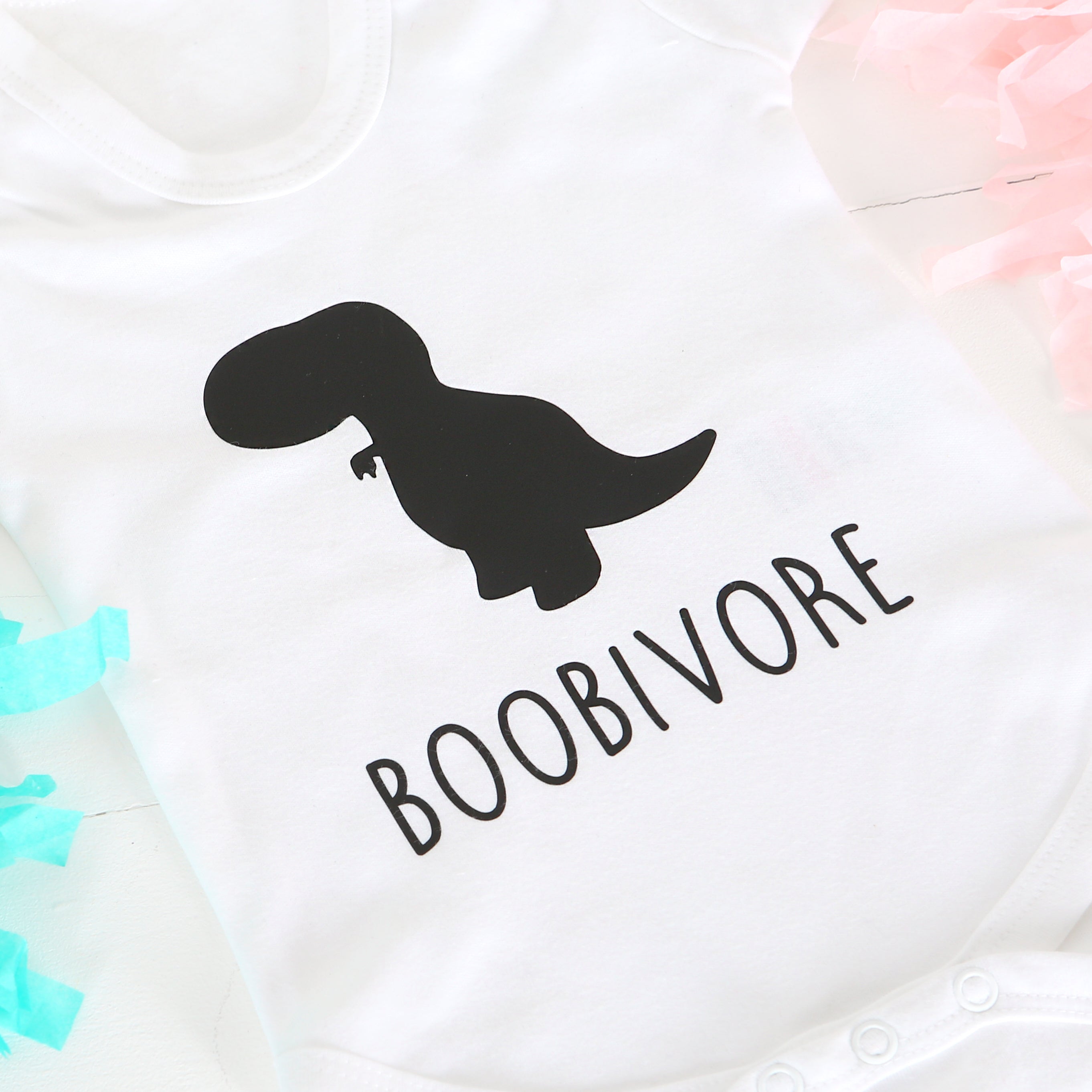 Amusing boobivore dinosaur baby grow vest, cute new baby gift