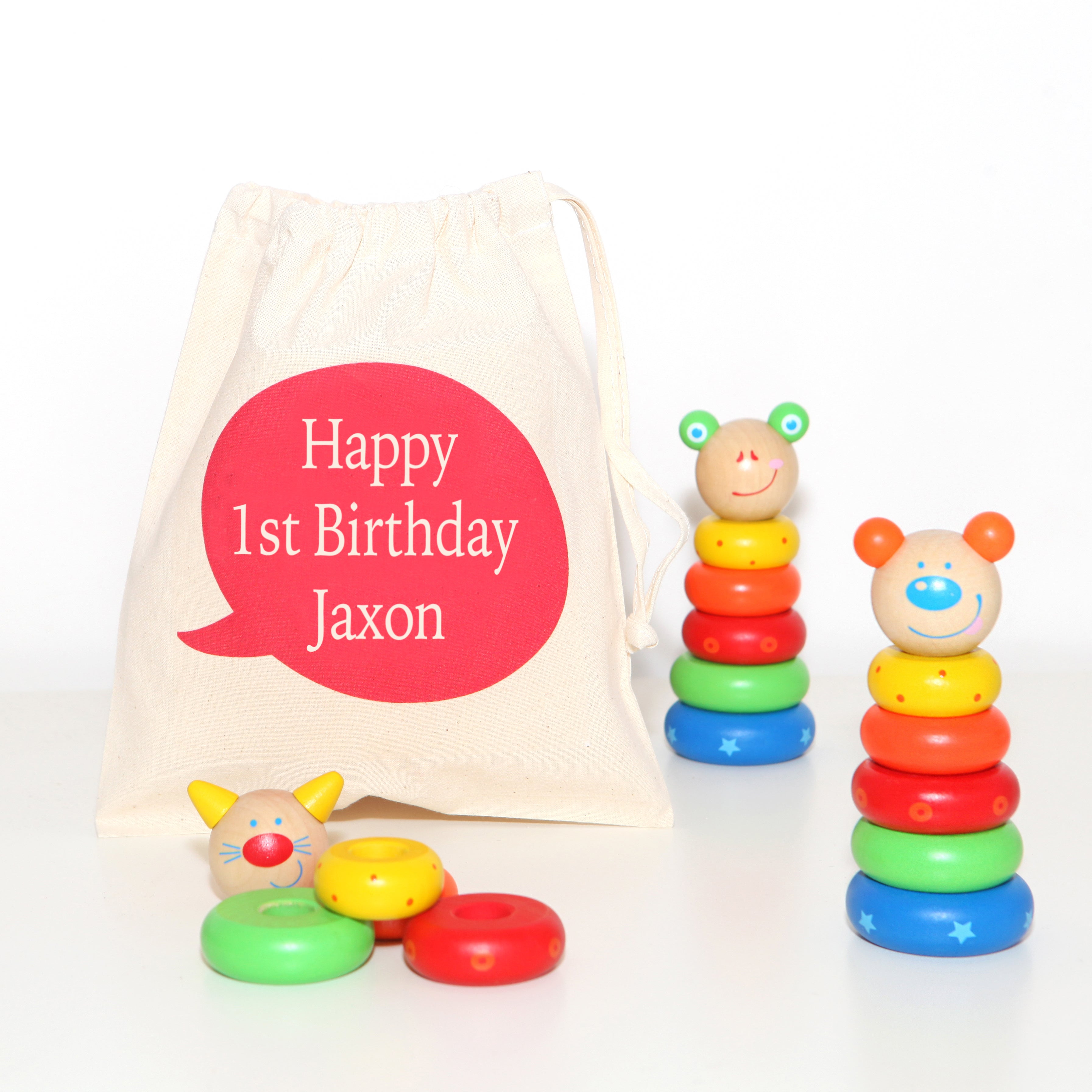 Looking for a first birthday or Christmas gift, this wooden animal stacker toy with personalised bag is an excellent choice for both boys and girls
