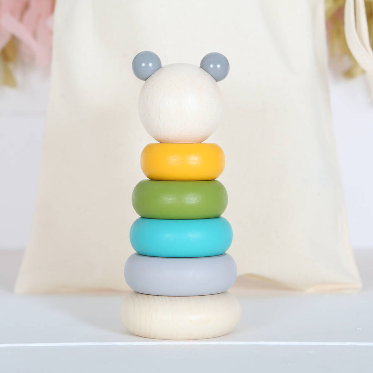 Cute wooden bear stacking toy in a personalised cotton bag, perfect first christmas or birthday gift
