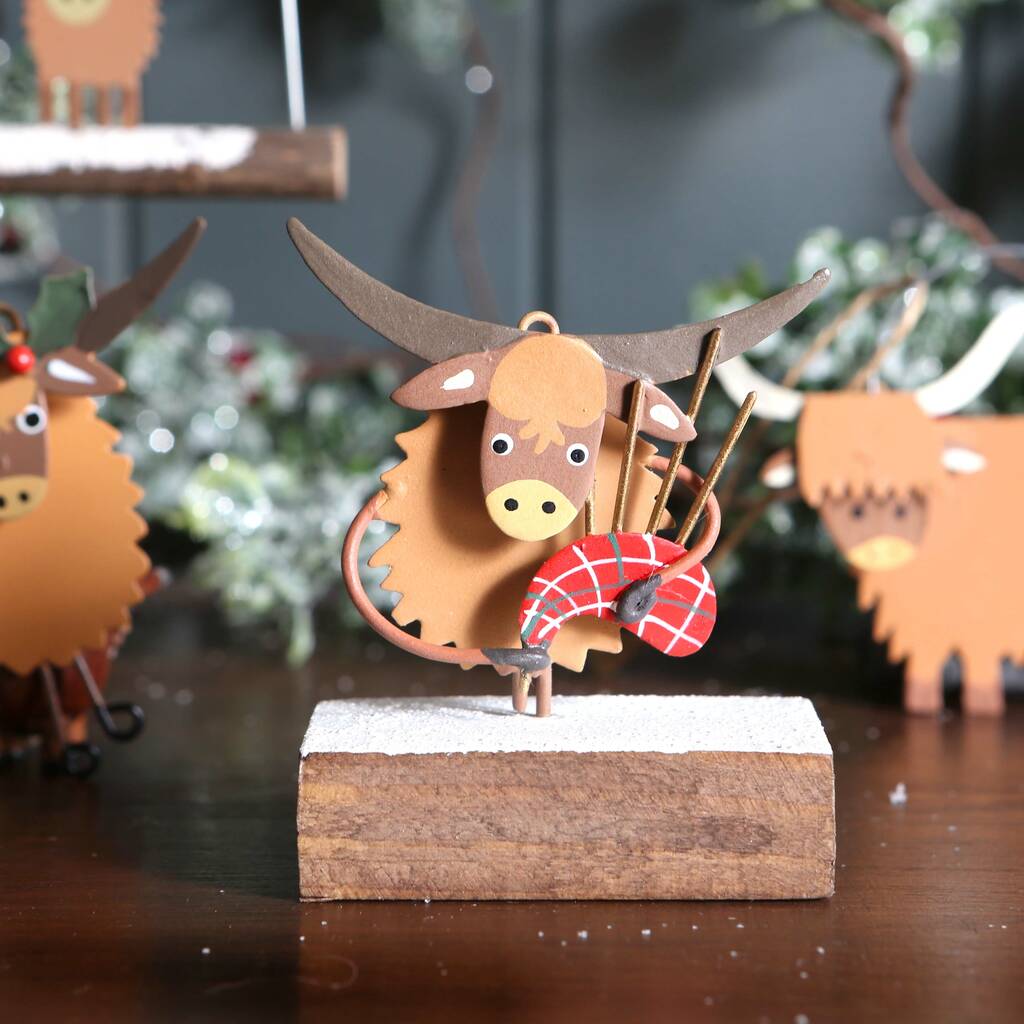 Fabulous highland cow standing on a snow covered block playing his bagpipes, makes a great addition to your chrismas decorations