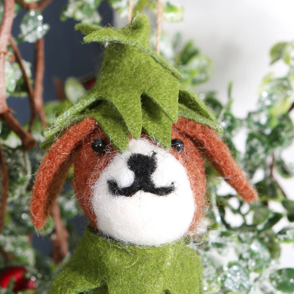 Charming Christmas tree decoration, the felt dog in proudly wearing his festive Christmas tree outfit