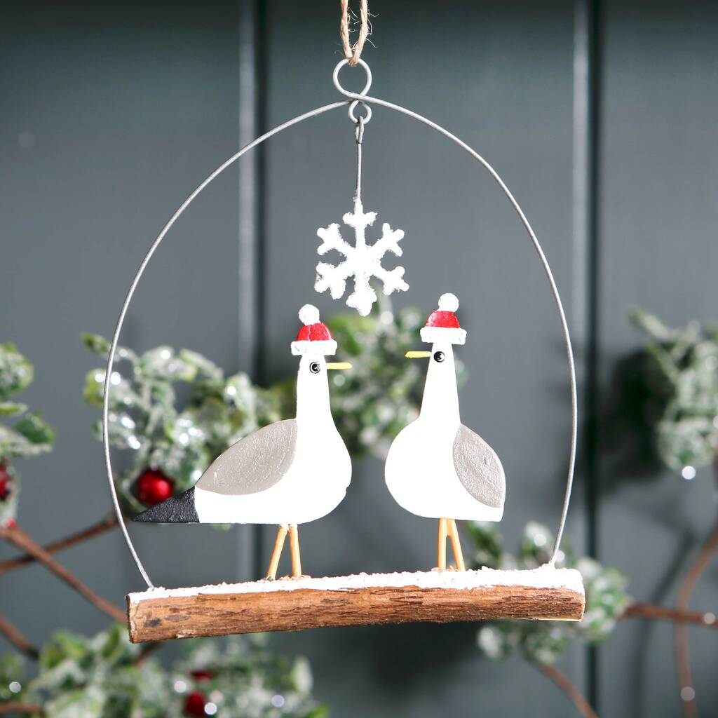 Dressed in their Santa hats and perched on a snow covered twig these little seagulls are enjoying the festive season