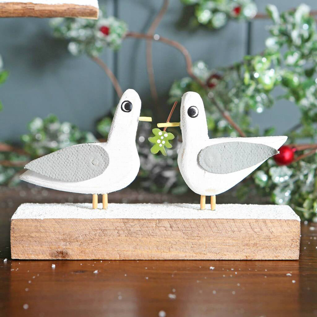 Two little seagulls with a sprig of mistletoe on a wooden block, a loveable Christmas gift for a seaside home