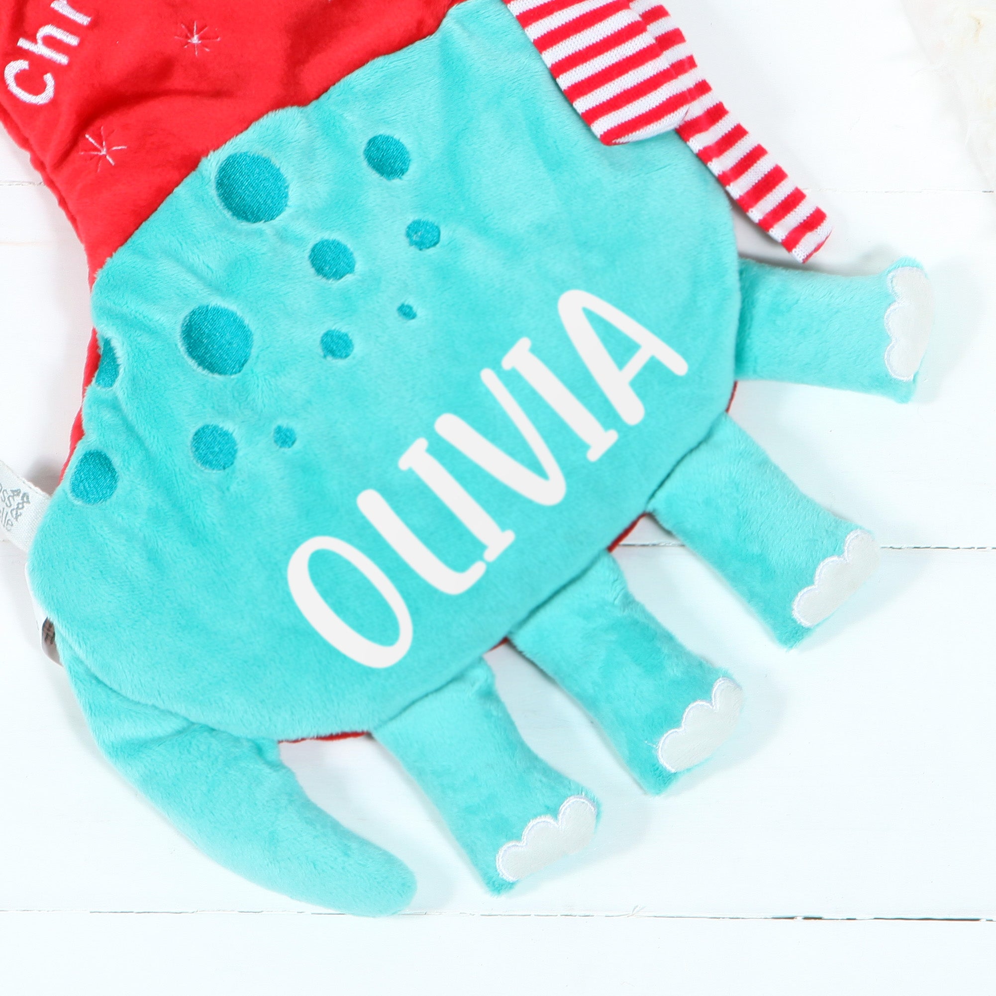 Fabilous personalised dinosaur Christmas stocking, soft plush stocking with name in white vinyl