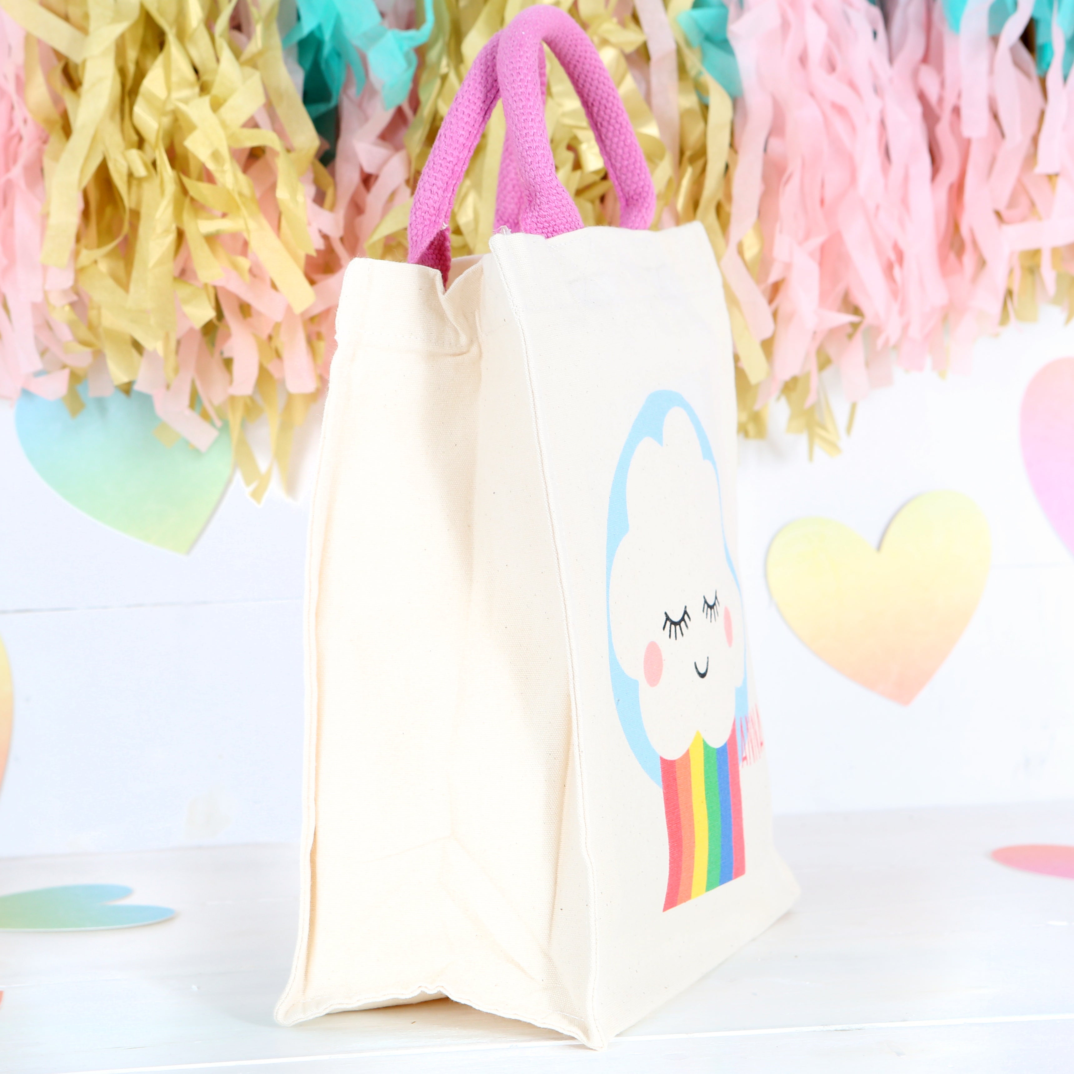 The natural cotton bag has pink rope handles and features a cloud with rainbow print and a name of your choice.