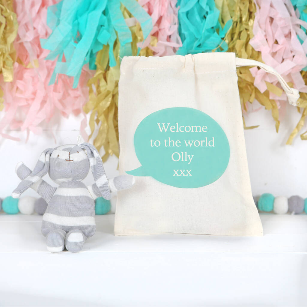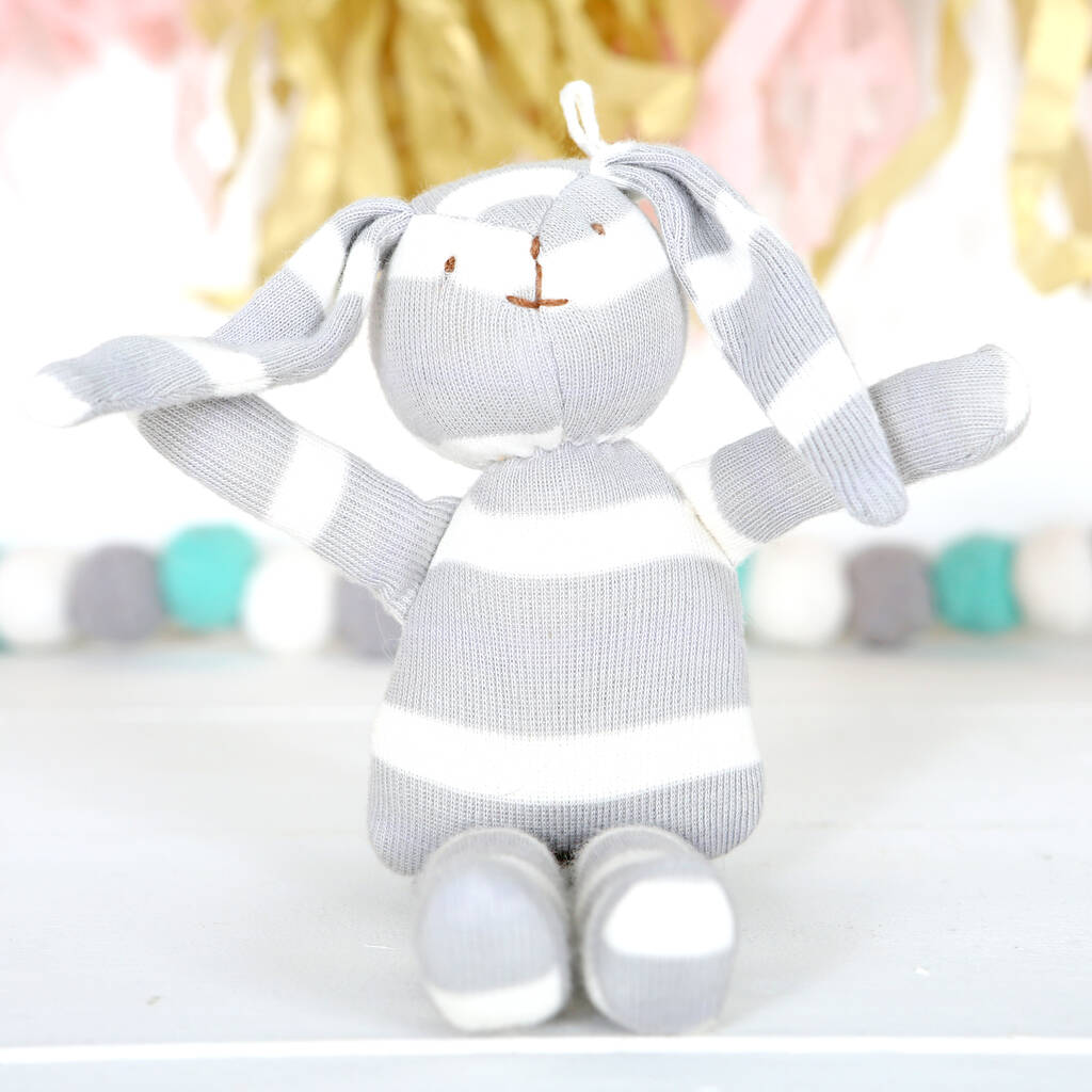 Cute grey and white striped organic cotton bunny rabbit with personalised gift bag. Great new baby gift this Easter