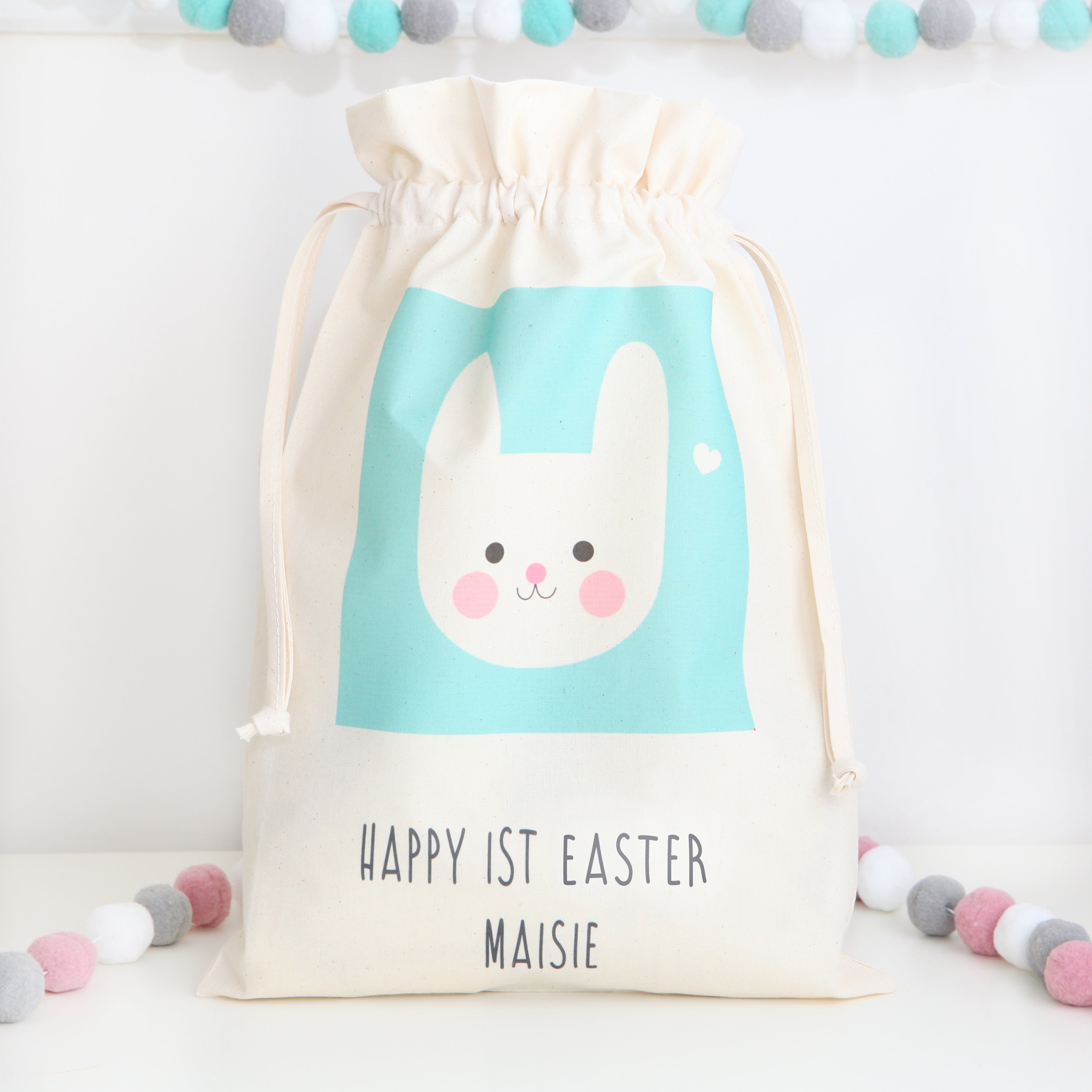Fabulous personalised double drawstring cotton bag with cute bunny rabbit motif, perfect gift wrap or nursery storage bag