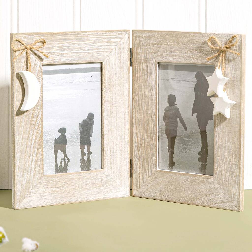 Wooden double portrait photo frame with slight white wash finish and hanging stars and moon detail, beautiful Christmas or birthday gift