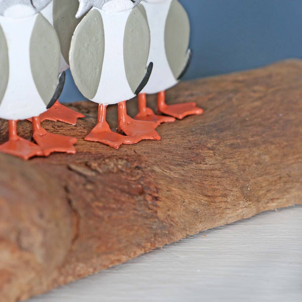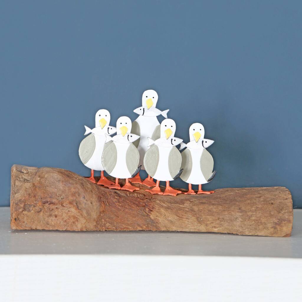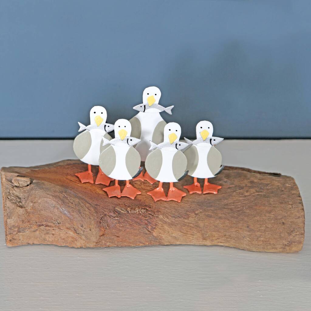 Amusing nautical decoration with five metal seagulls on a driftwood block