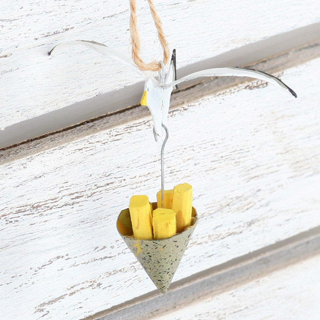 Great for any nautical or seaside themed room in your home or holiday home, this hanging seagull decoration with a bag of stolen chips is an easy way to add some fun to your decor.