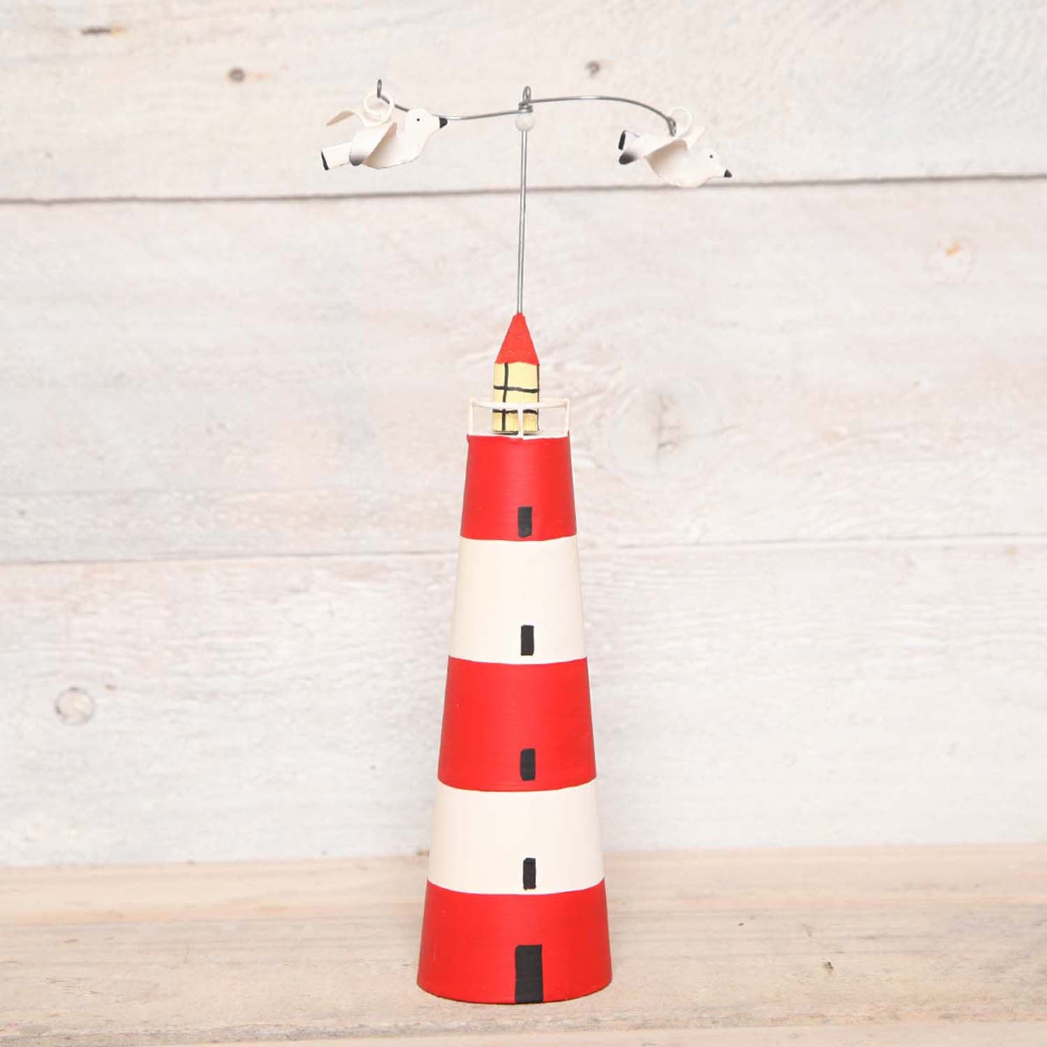 The metal seagulls to the top are free hanging and can move around the lighthouse.