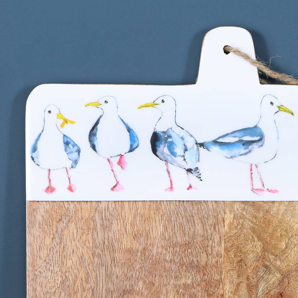 Fabulous mango wood chopping board with seagull print and jute hanging loop