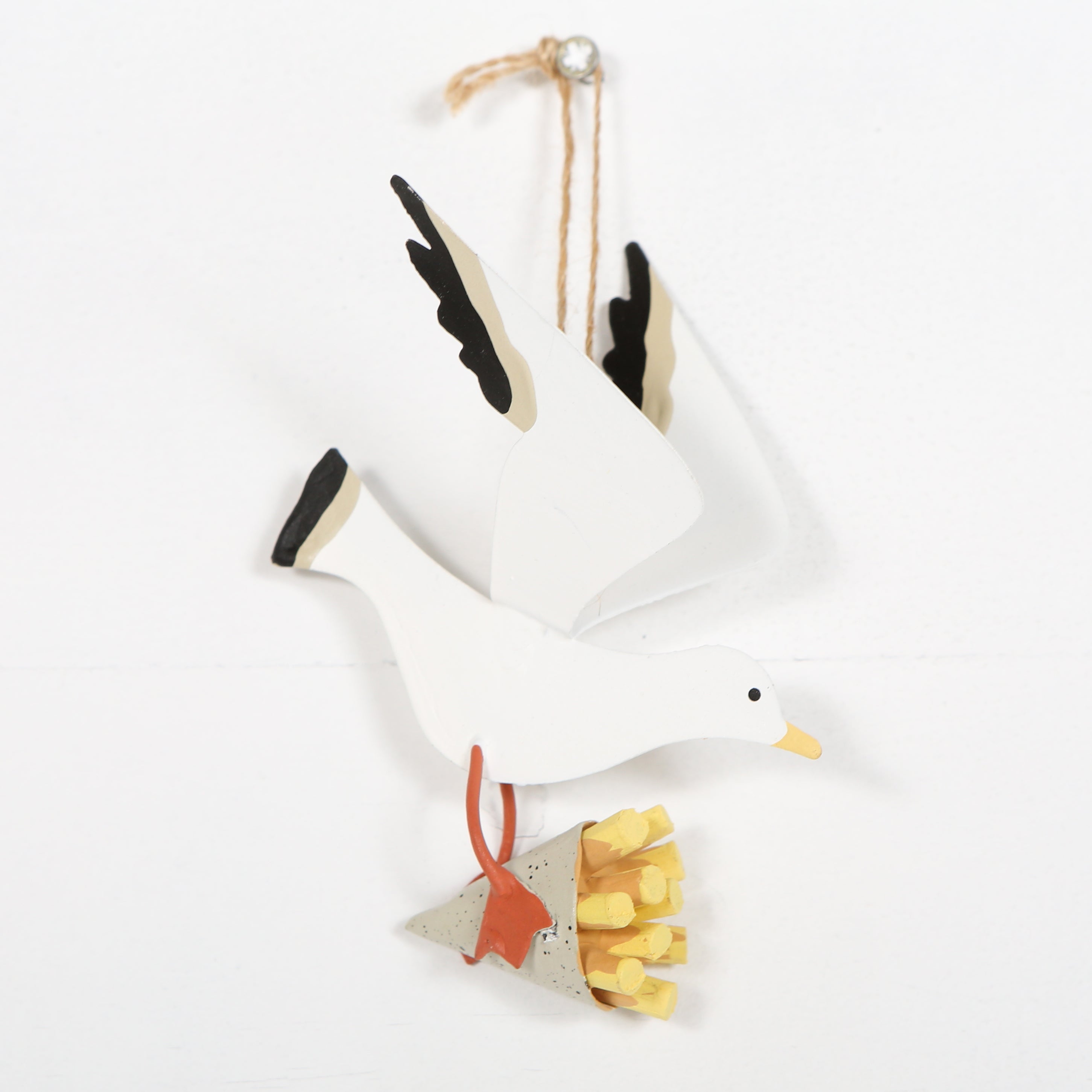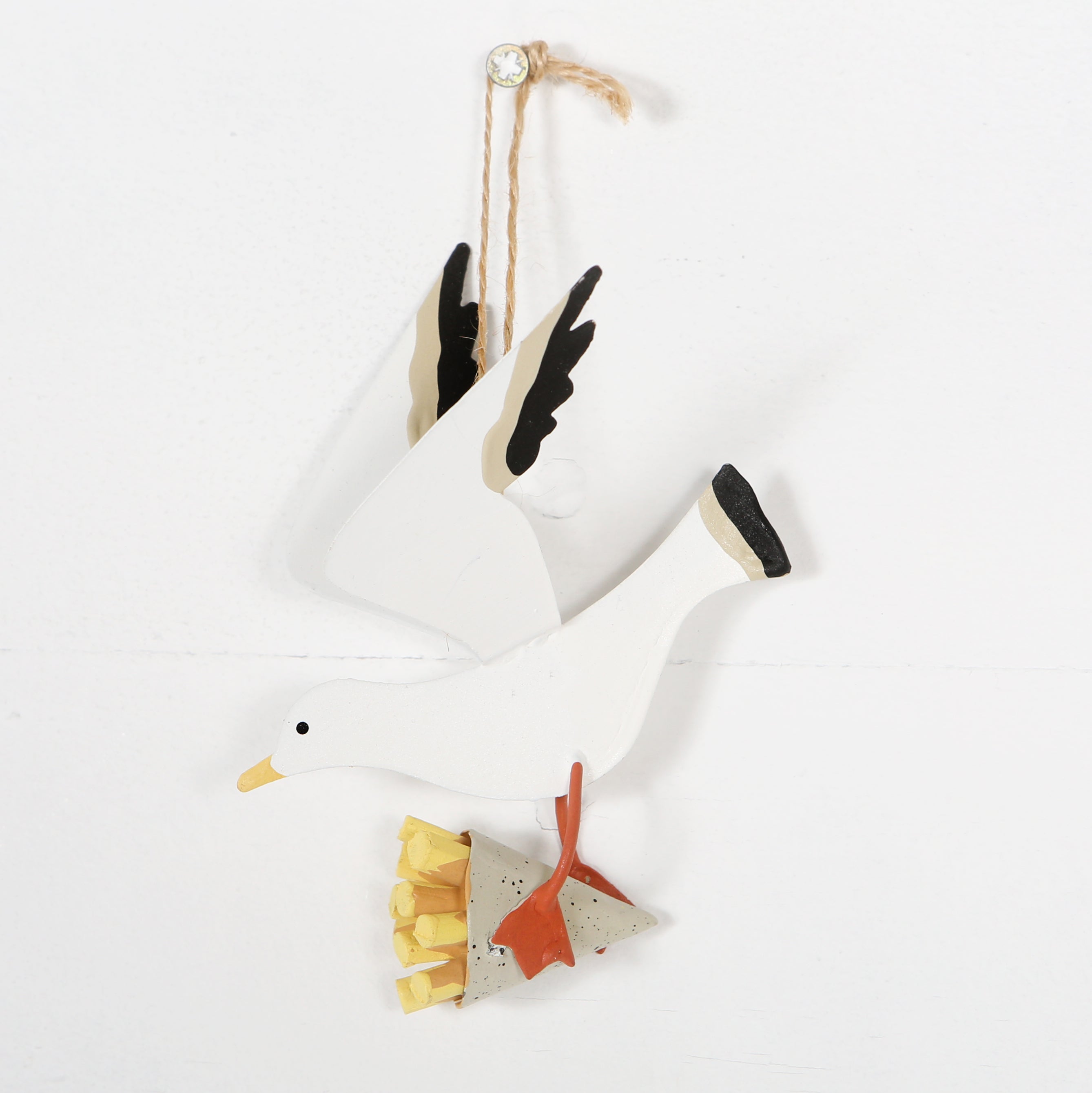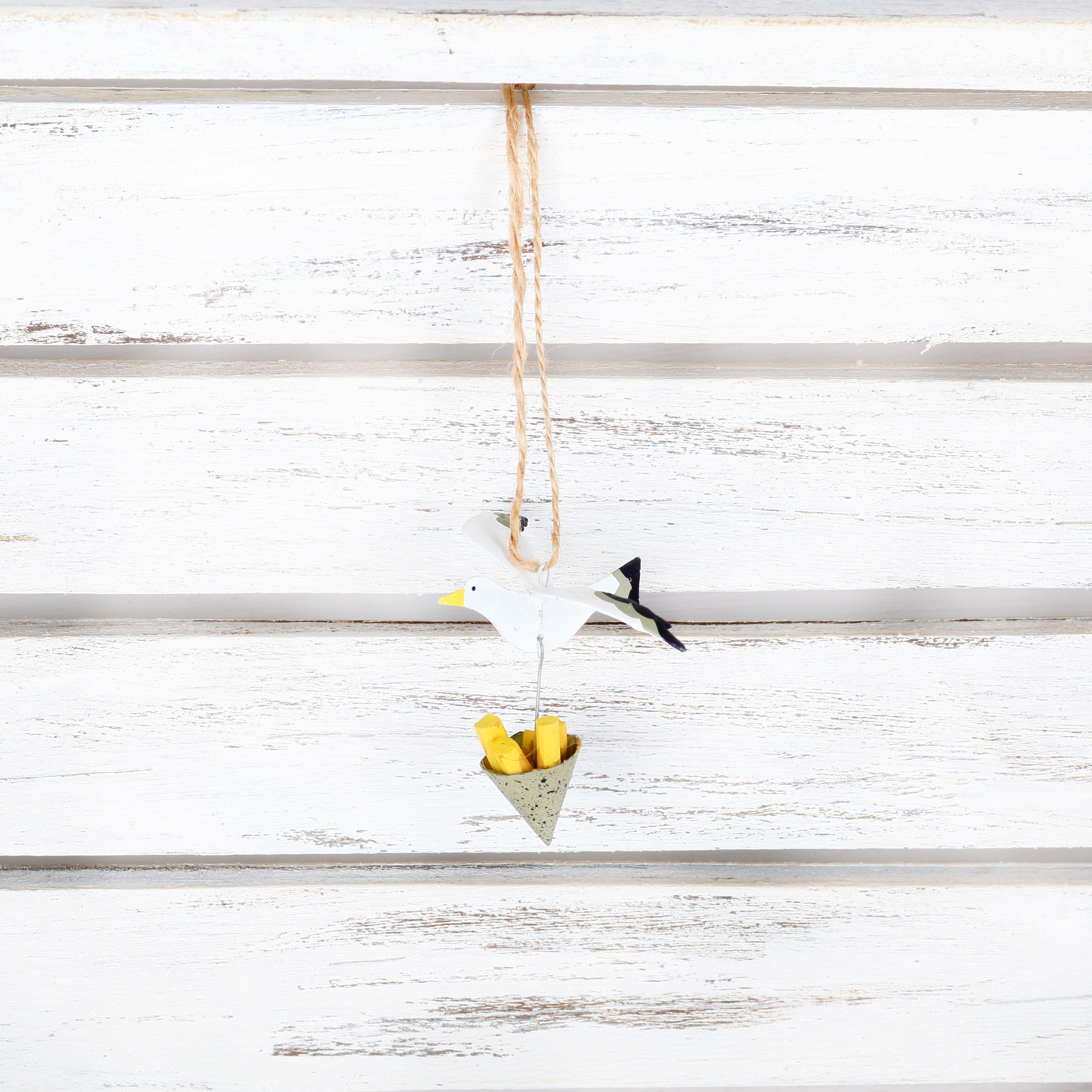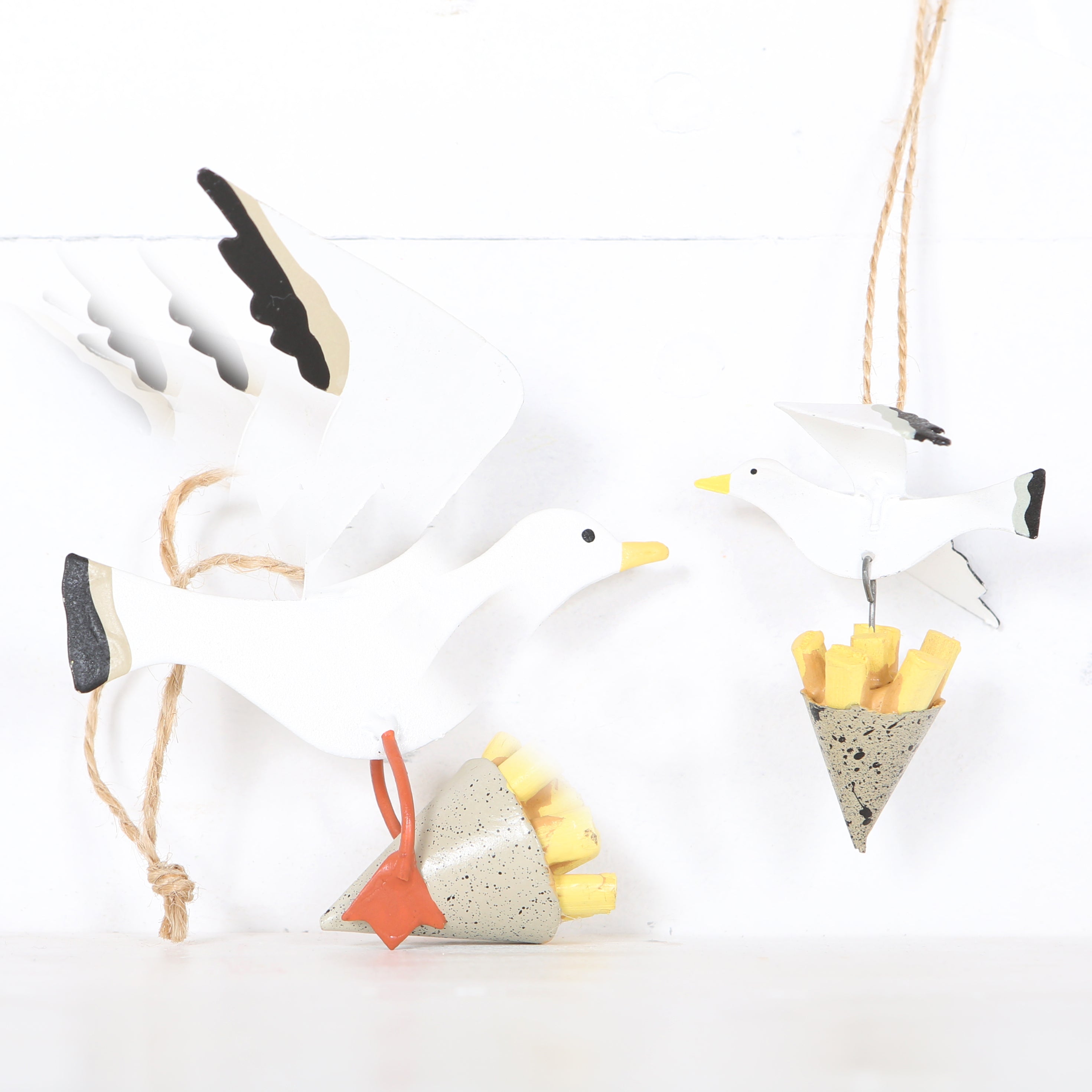 Great for any nautical or seaside themed room in your home or holiday home, these little hanging seagull decorations with their stolen chips are an easy way to add some fun to your decor.
