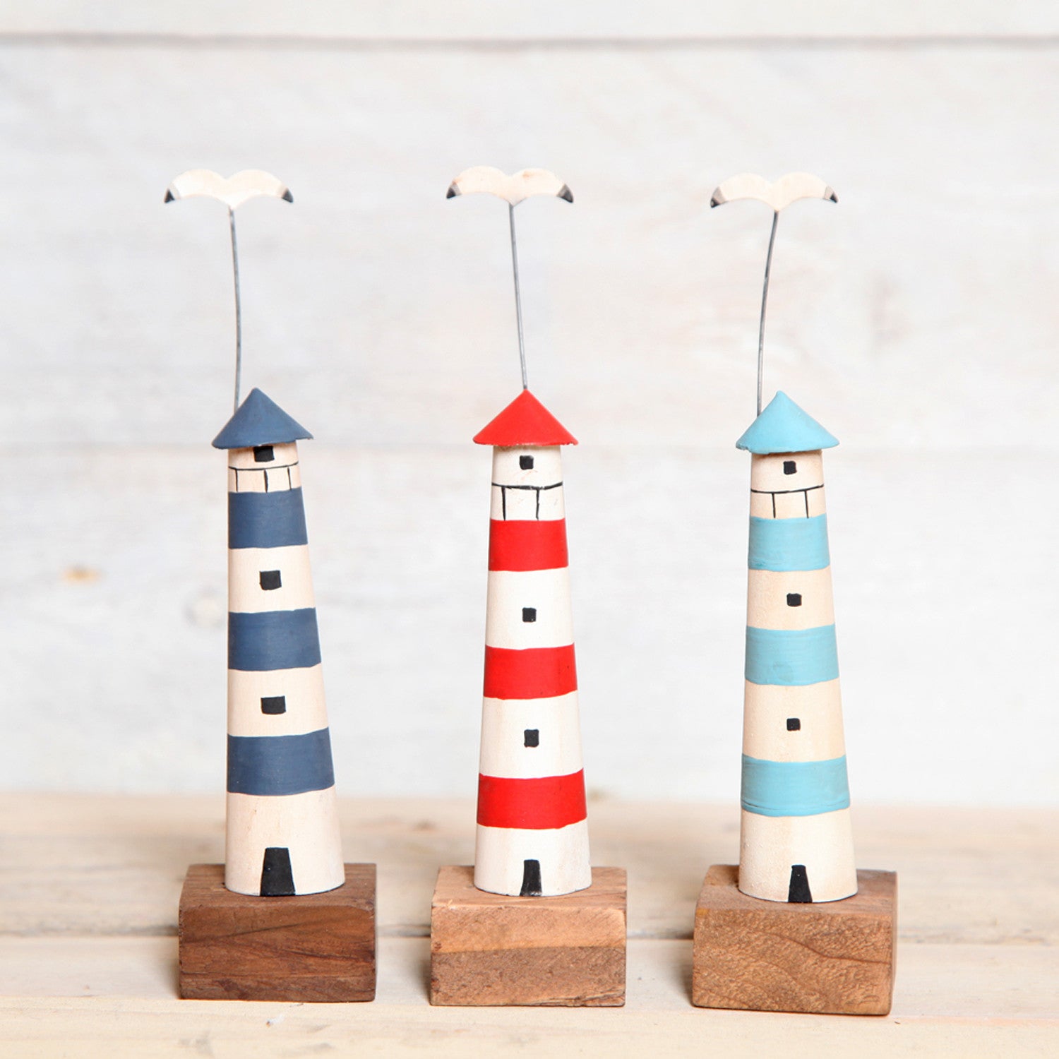 Each wooden lighthouse is mounted on a wooden block and feature hand painted stripes and windows. Finished with a seagull flying over head for added interest.