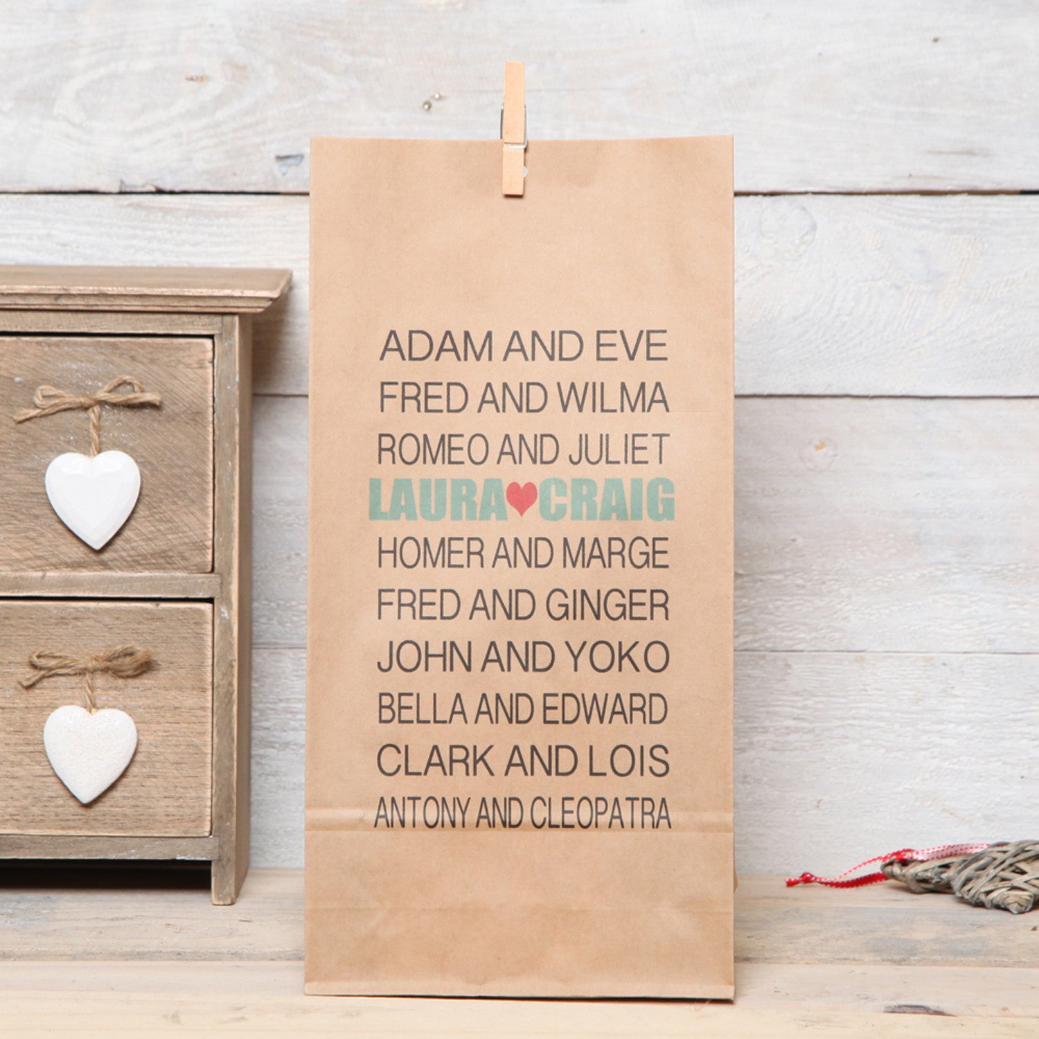 A famous couple themed kraft paper gift bag. Each bag features the names of 9 couples old and new
