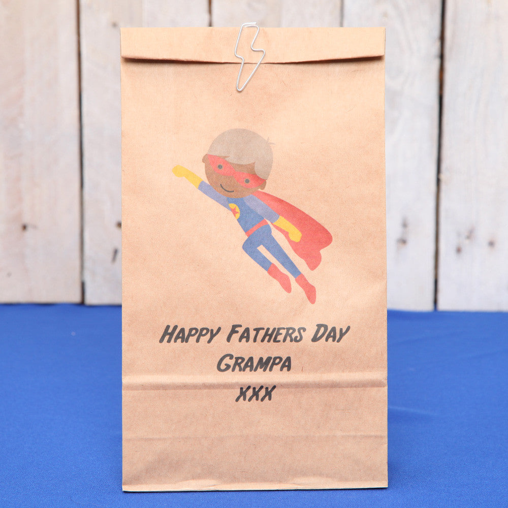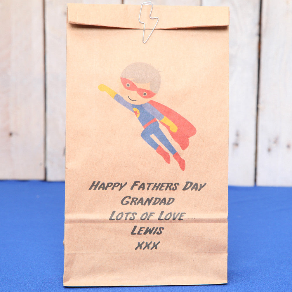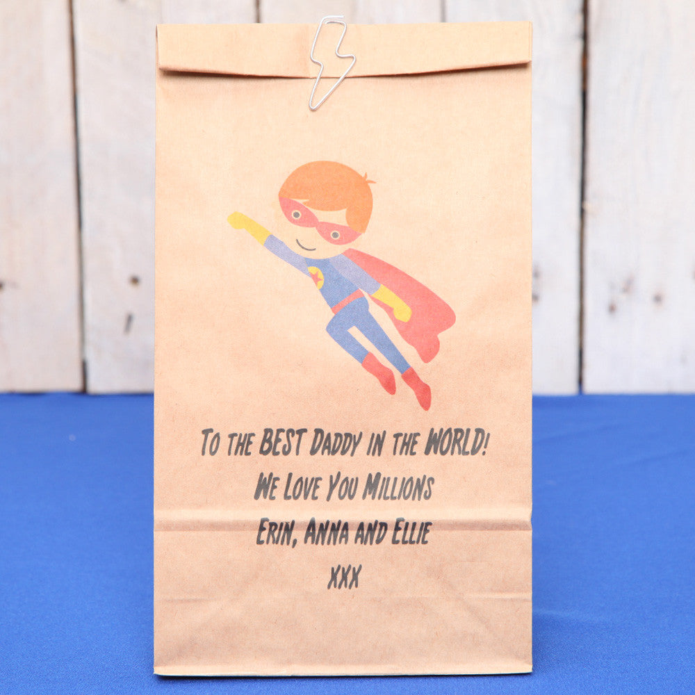 Available in a choice of hair colour and skin tone options for a truly personalised gift bag. and perfect for those super hero husbands, dads, grandpa's, brothers and uncles.