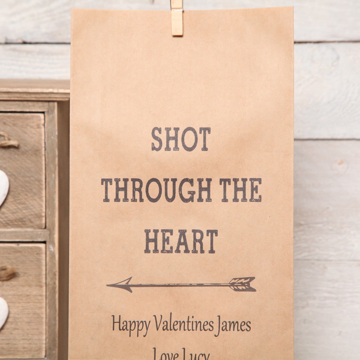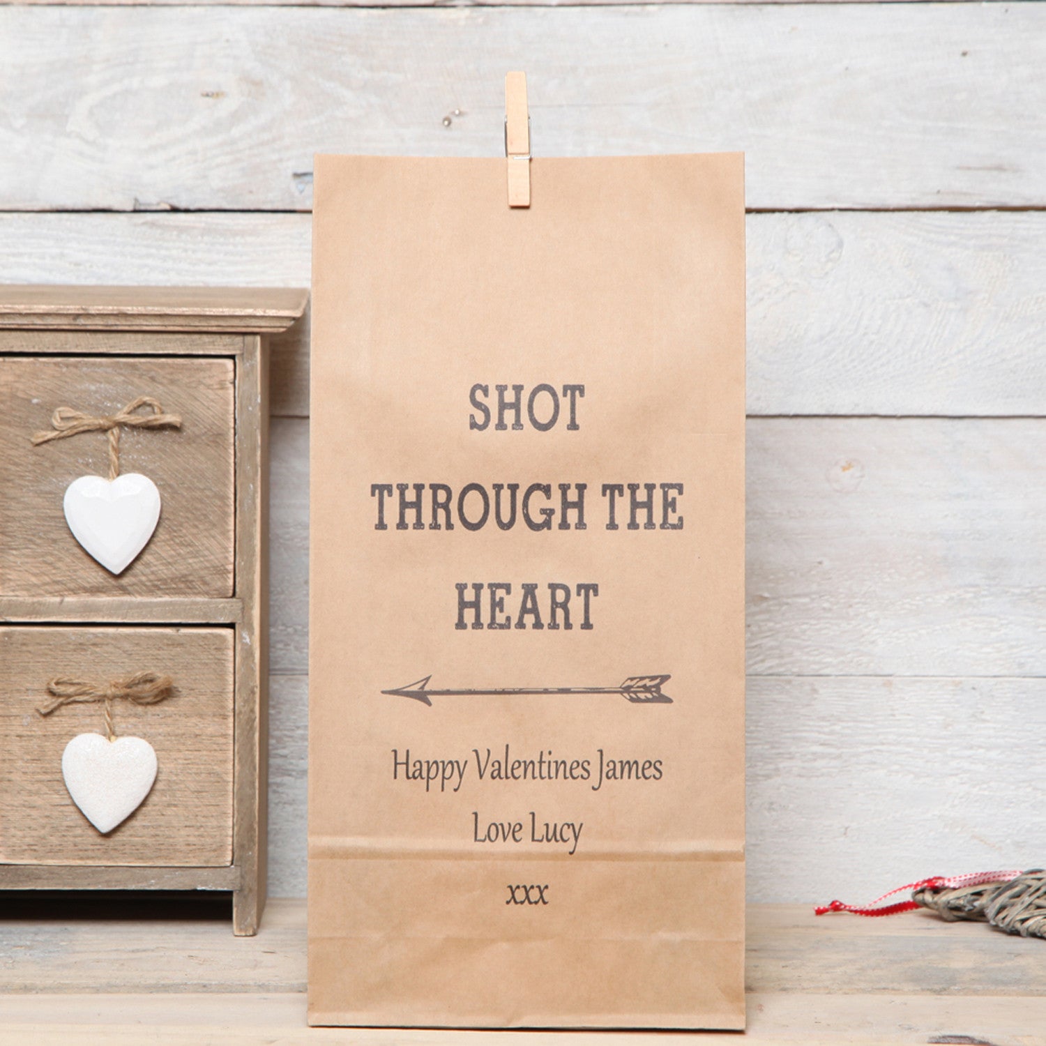 Kraft paper gift bag with the bon jovi lyrics, shot through the heart.