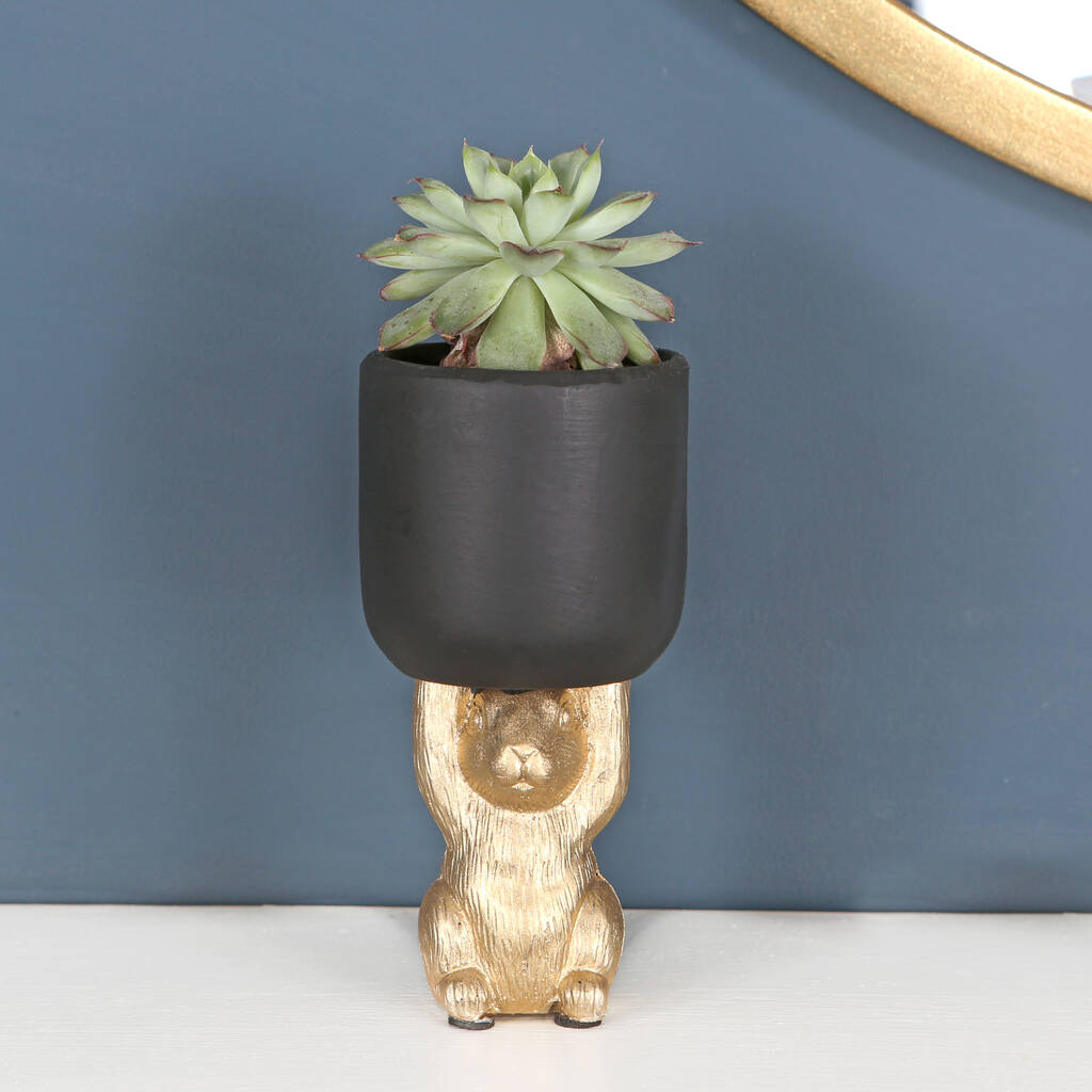 This adorable gift features a gold coloured bunny rabbit who is acting as a stand for a small matt black plant pot