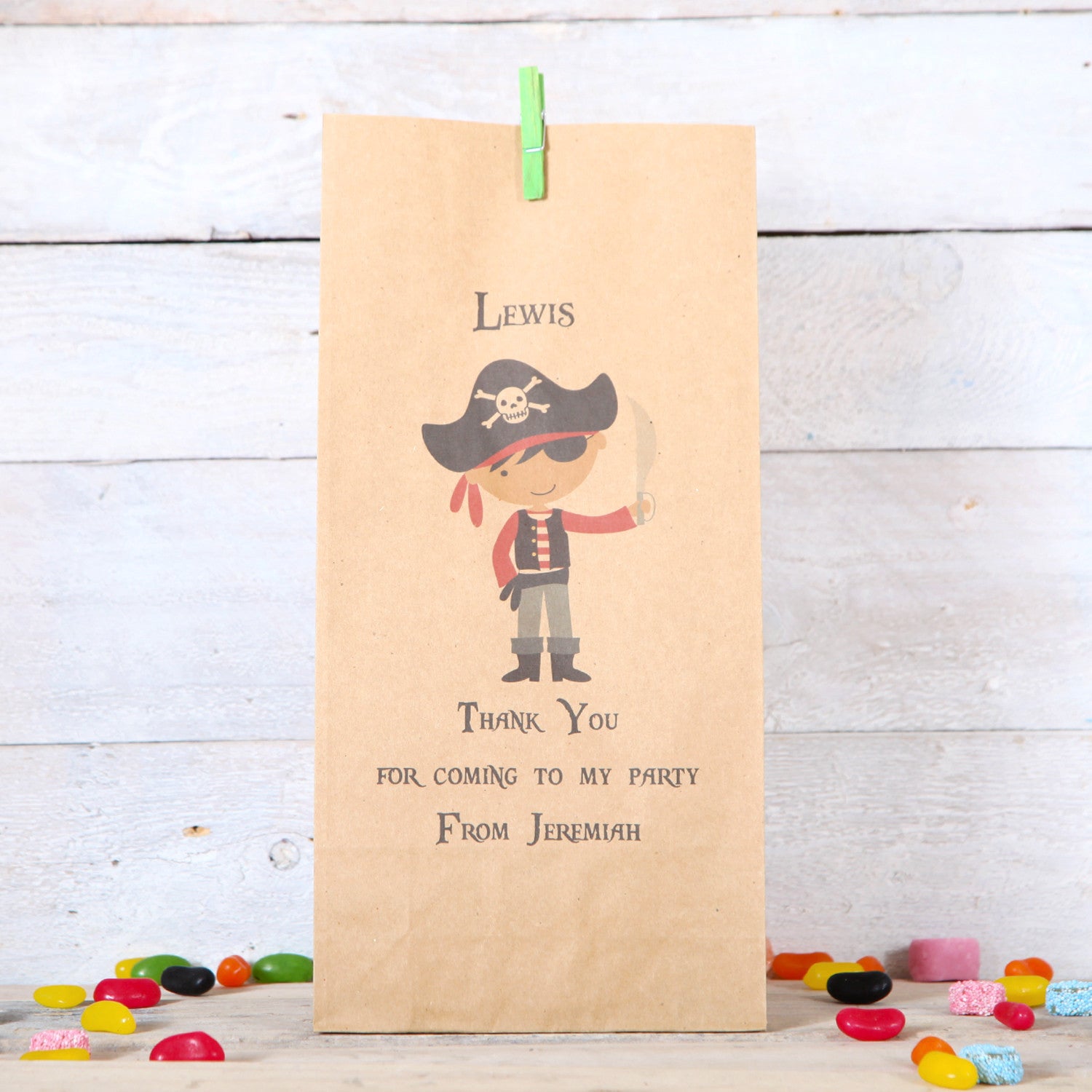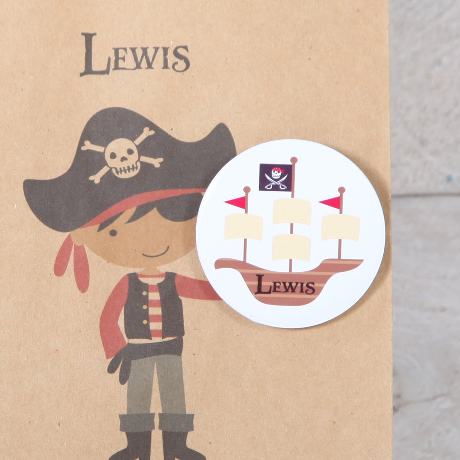 Personalised Kraft paper party bags in a pirate design.