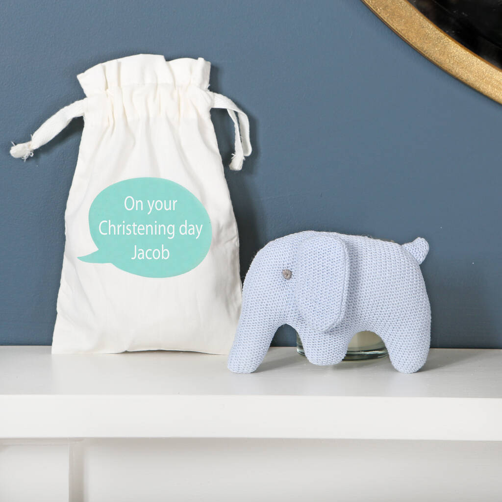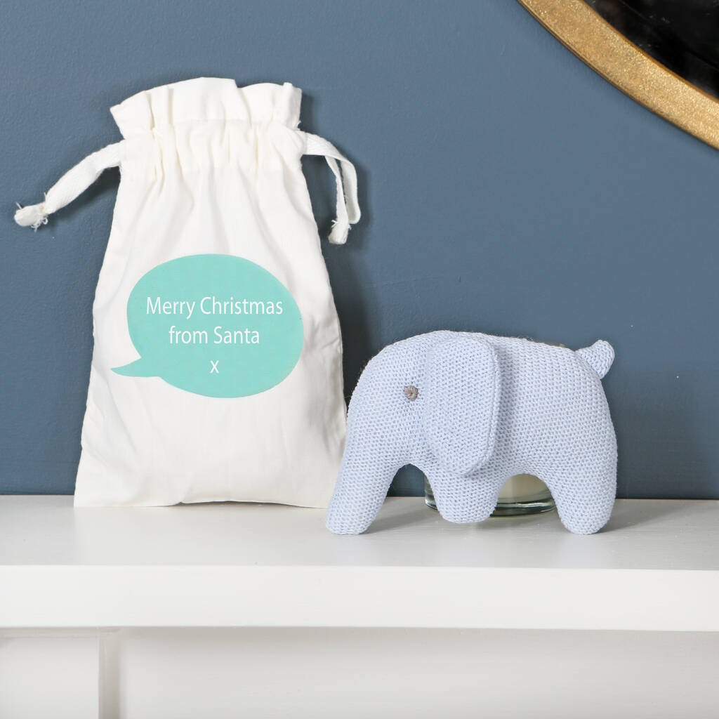 Beautiful knitted 100% organic cotton pink elephant rattle with personalised bag