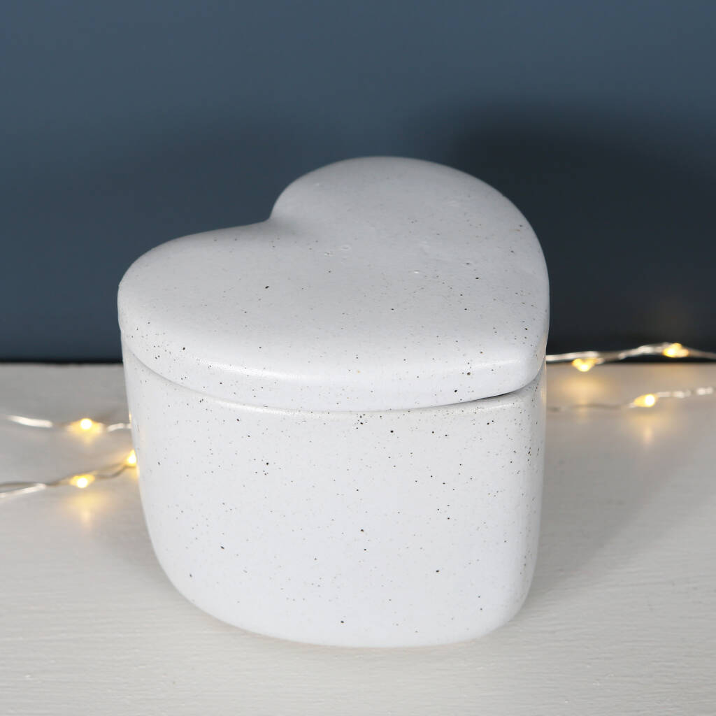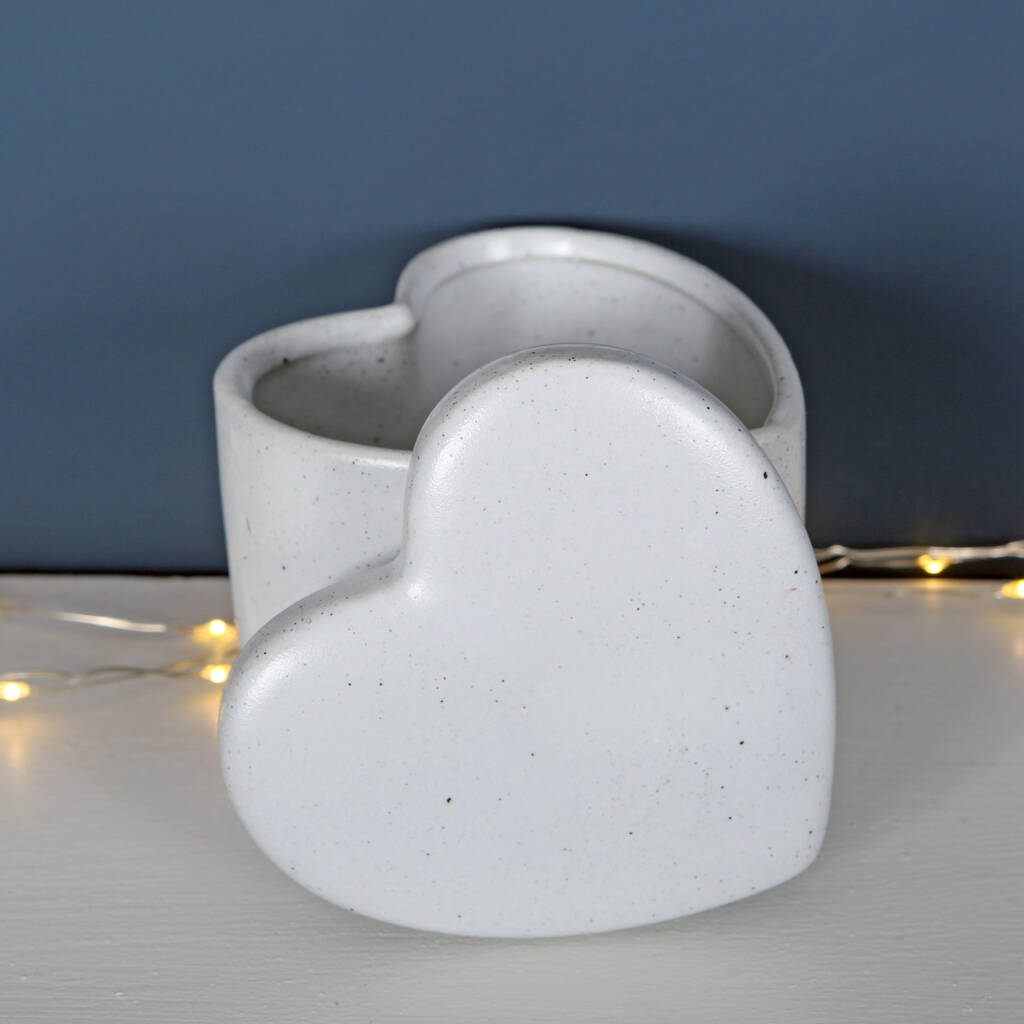 This litte heart shaped ceramic trinket box with lid will look great in any room of the house