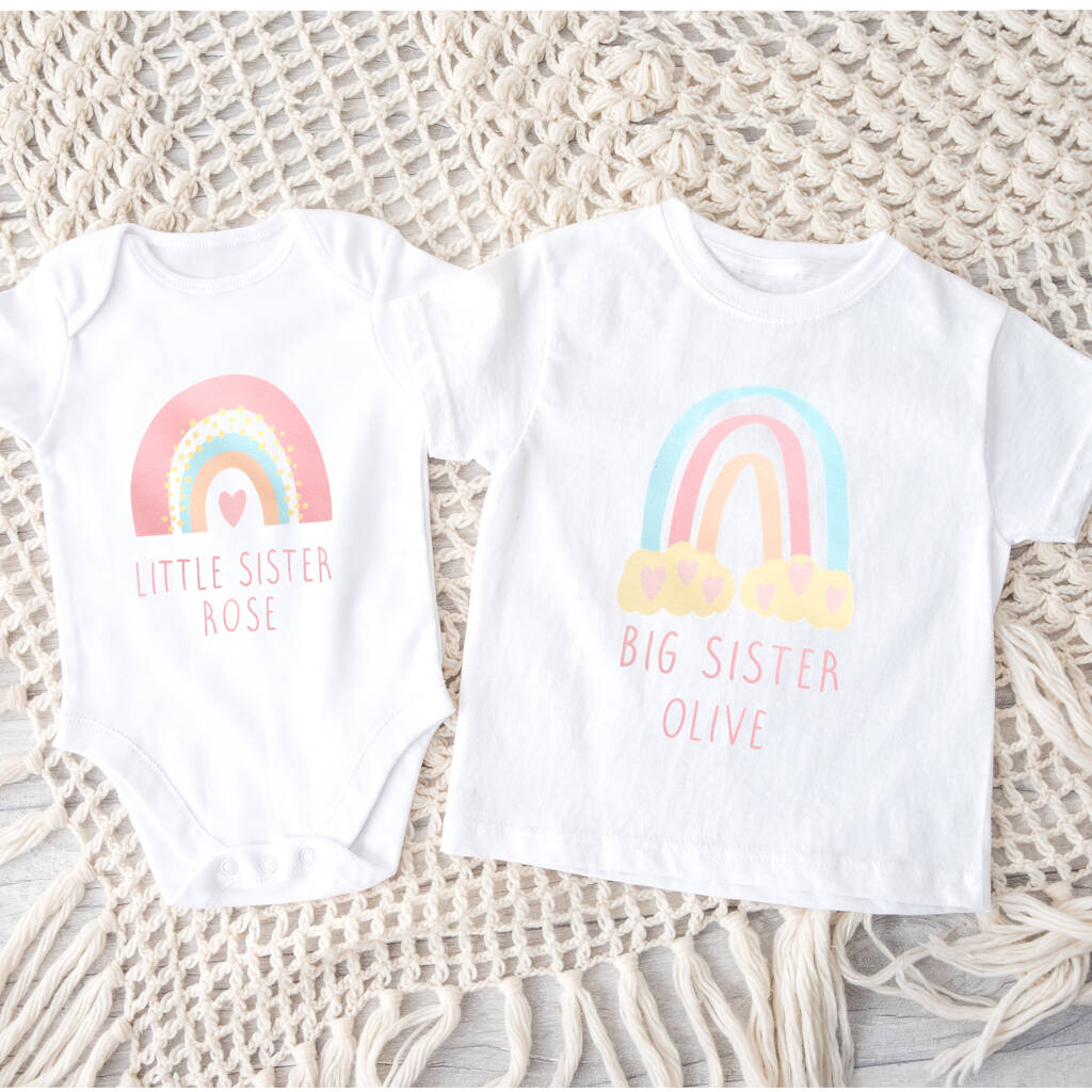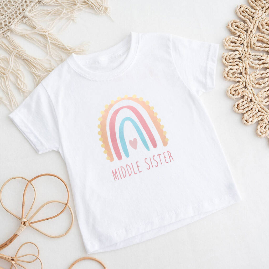 If you're looking for the perfect gift for a newborn and their siblings, you'll love our soft white t-shirts with pastel rainbow designs. Choose from three styles: Big Sister, Middle Sister, and Little Sister. We have sizes available from 3-12 years old and optional baby vests for 0-3 months. You can also add their name under the sister text to make it extra special.
