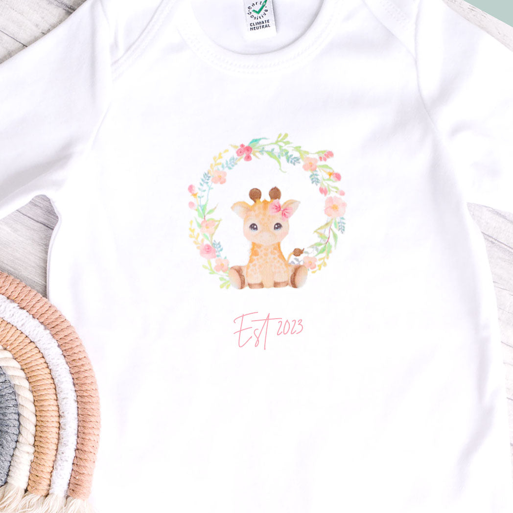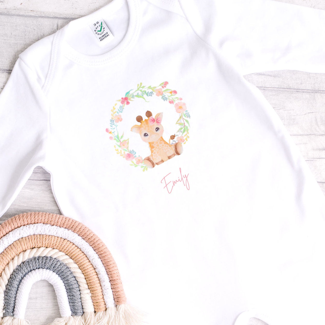 Our white organic baby grown with pink baby giraffe design is a lovely item for your little one.