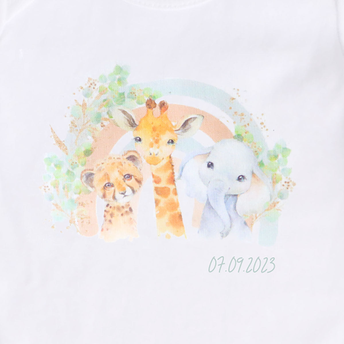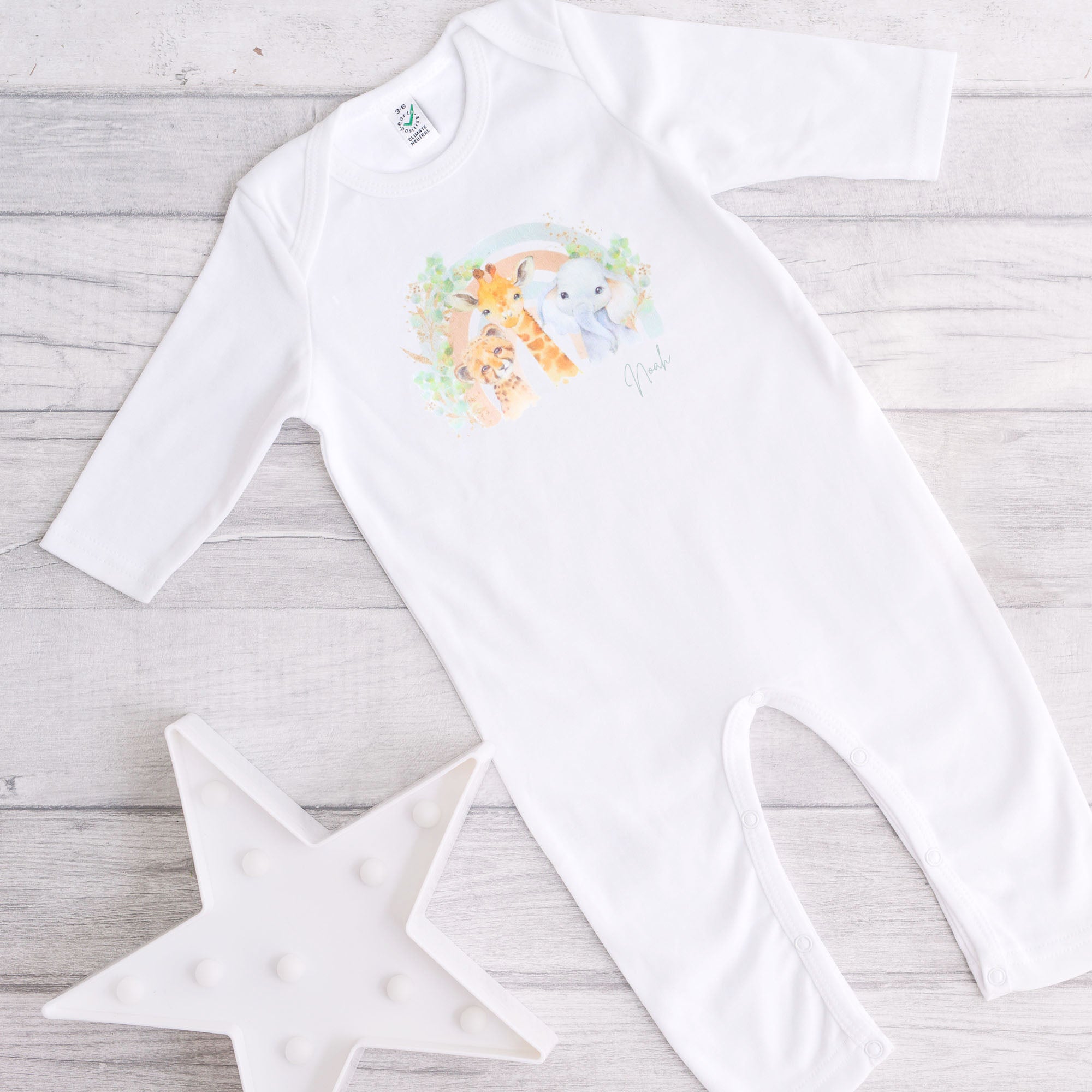 Beautiful organic cotton baby grow with a safari animal design in neutral colours.