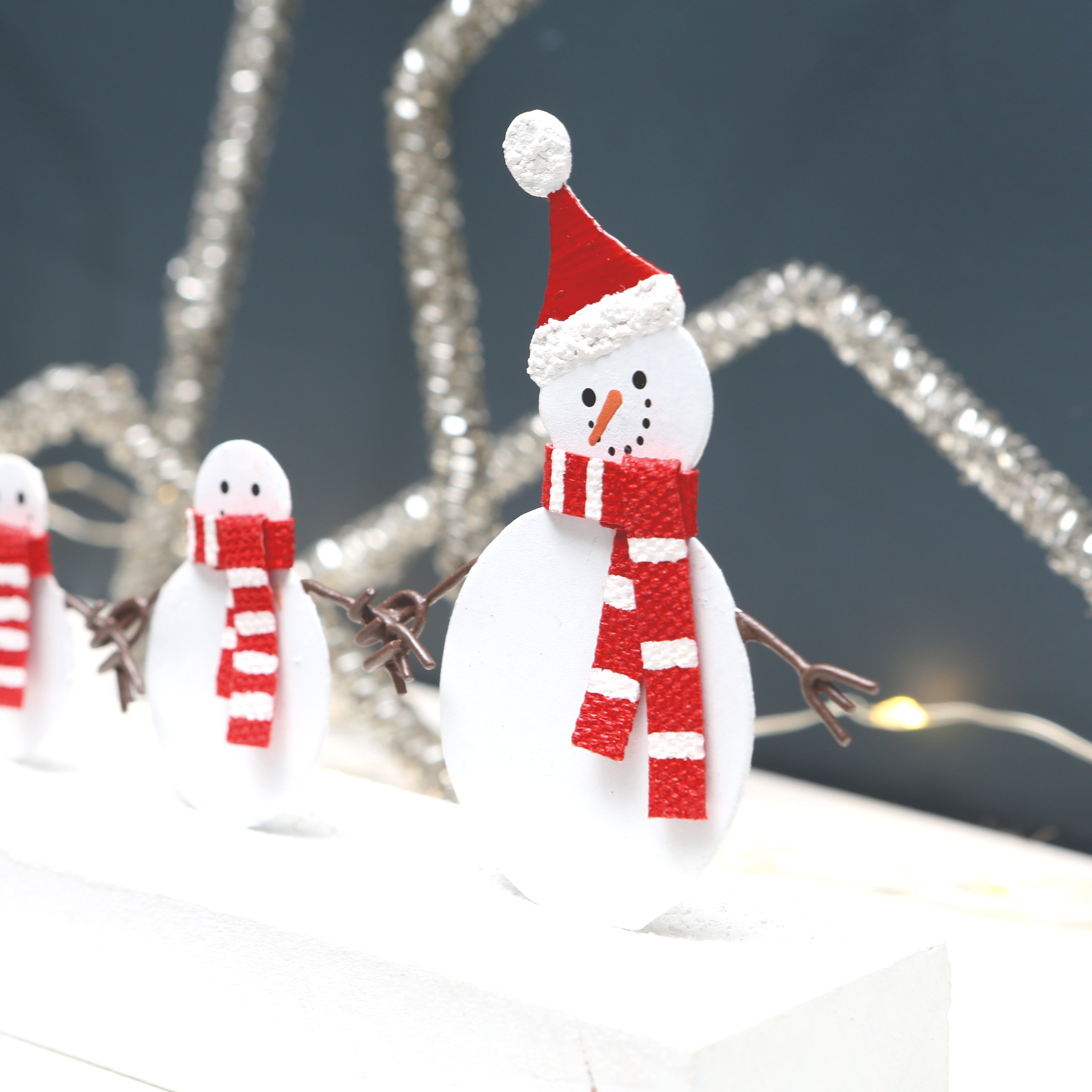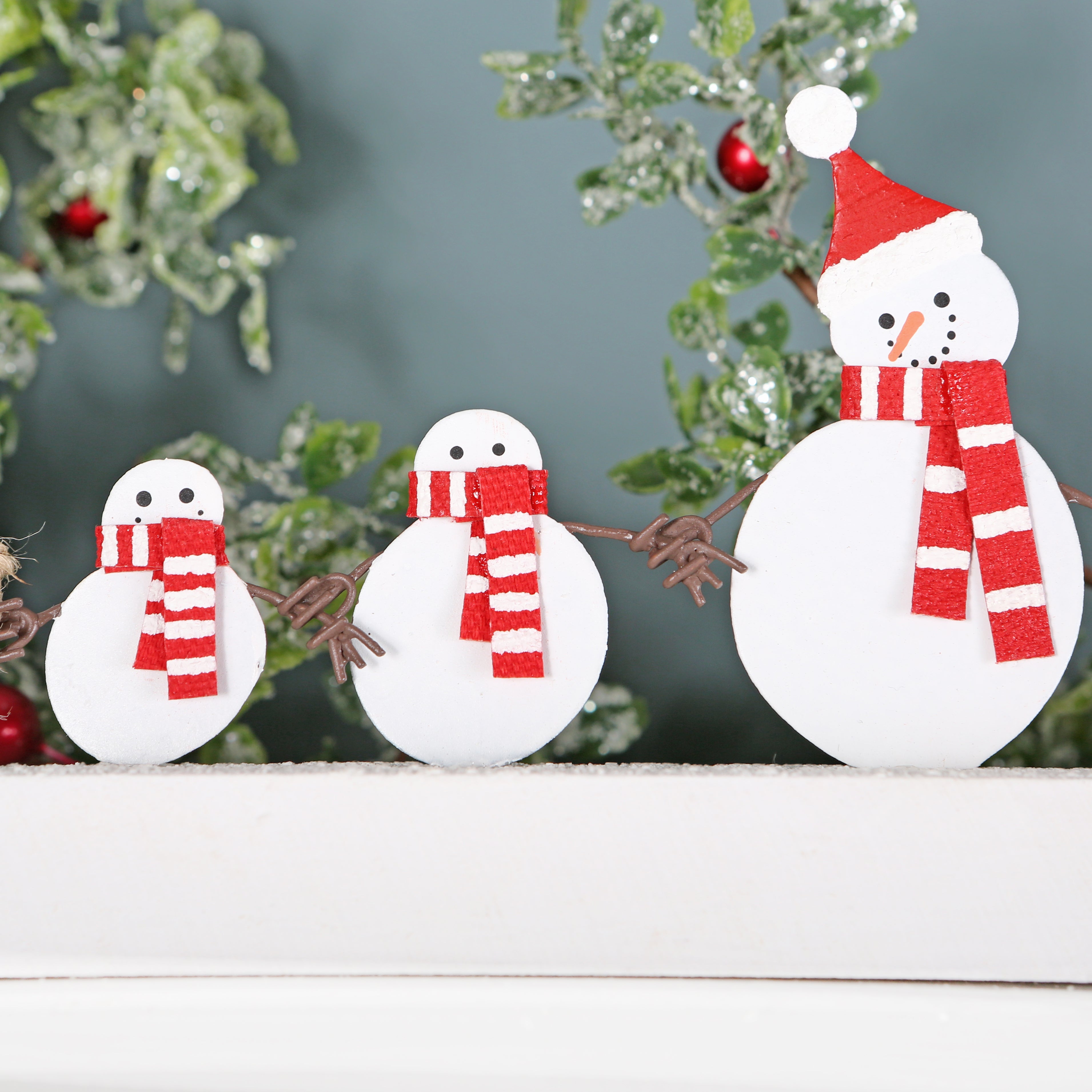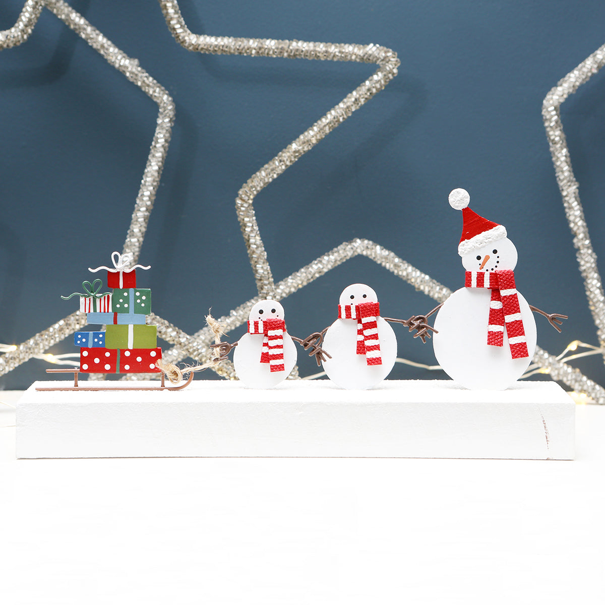 The cheerful snowman family in their red and white stripey scarves have a sledge full of presents