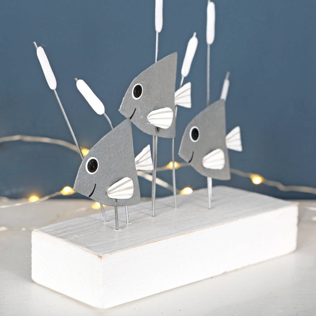 Fabulous trio of 3 silver metal fish on white wooden block decoration